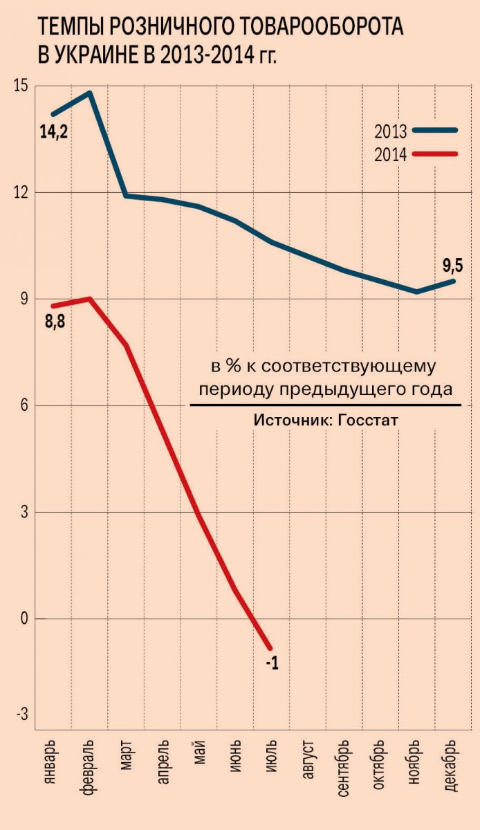 Последний раз спад розничных продаж Госстат фиксировал еще в апреле 2010 г., когда экономика только оправлялась от последствий финансового кризиса. Последние же несколько кварталов розница демонстрировала замедление темпов роста, но отнюдь не падение. Даже несмотря на весеннюю девальвацию гривни и нестабильную ситуацию в Донбассе, украинцы все равно увеличивали объем покупок.