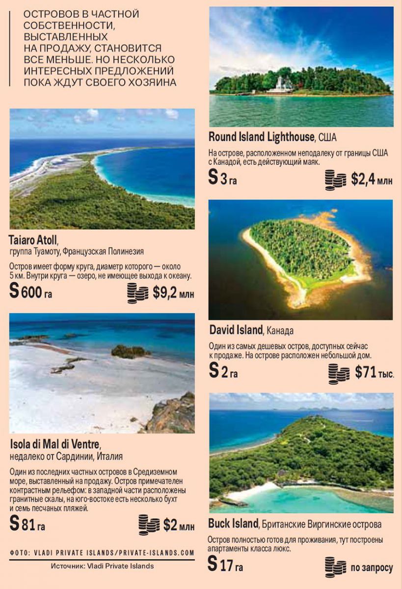 Покупка острова в среде состоятельных людей давно стала делом привычным. В этот условный клуб входят руководитель Oracle Corp Ларри Эллисон (отдал $ 300 млн за 98 % острова Ланаи на Гавайях), основатель Virgin Group Ричард Брэнсон (за $ 180 тыс. приобрел остров Некер на Британских Виргинских островах). Американский медиамагнат Тэд Тернер купил за $ 2 млн остров Святого Филиппа у побережья Южной Каролины (США), а покупка островов у побережья Греции обошлась российскому предпринимателю, собственнику ФК «Монако» Дмитрию Рыболовлеву предположительно в $ 100 млн. Джонни Депп, владеющий Литтл Холл Понд Кэй на Багамах, как‑то признался, что на этом острове он отдыхает как нигде. «Бегство на остров — это способ выживания, — заявил актер. — За деньги счастья не купить. Зато можно купить достаточно большую яхту, которая отвезет вас туда, где вы будете счастливы».