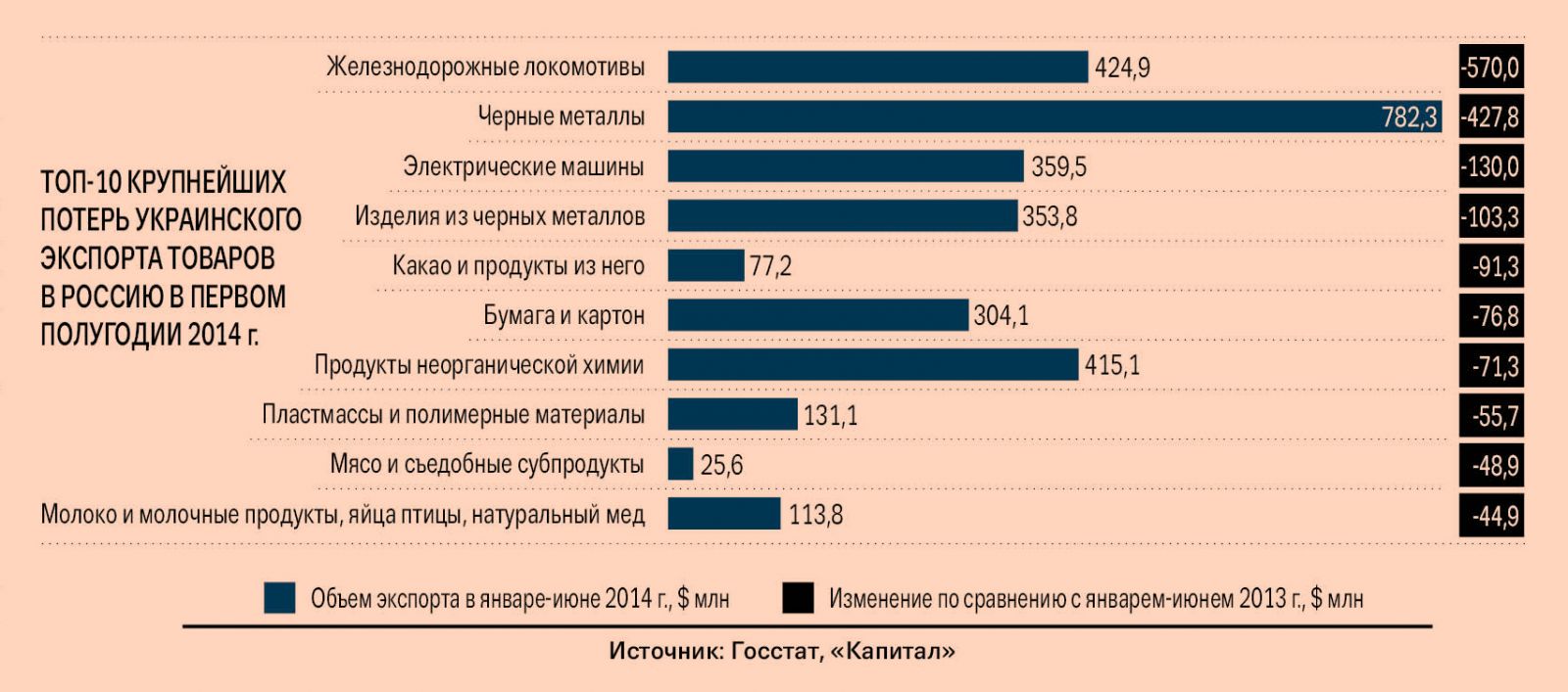 В денежном выражении это обеспечило прибавку в $ 1,1 млрд — до $ 9,5 млрд. В то же время объемы поставок в страны ТС сократились в два раза — на 27,4 %, в том числе в Россию — на 23,3 %. Это лишило украинскую экономику экспортной выручки на $ 2,7 млрд, из которых $ 1,9 млрд потерь пришлось на РФ.