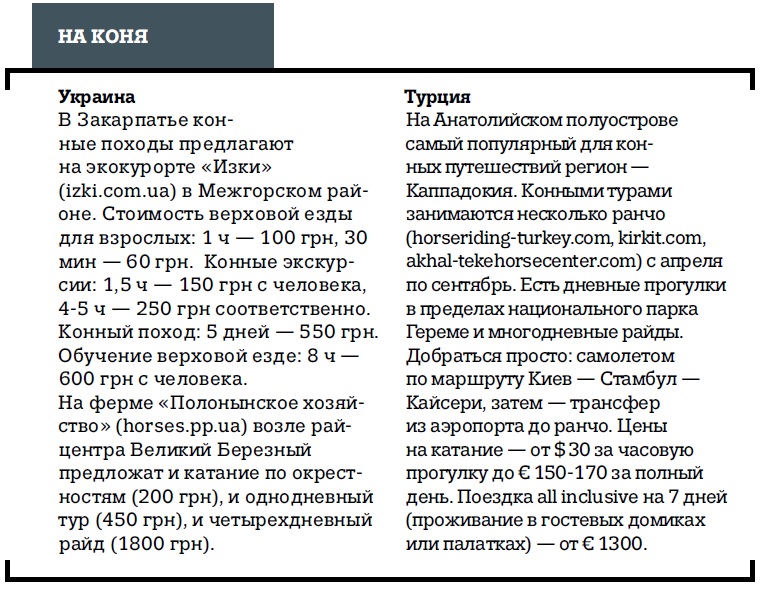Граждане Украины на конных маршрутах встречаются редко. Немалую роль в таком положении дел играет то, что украинцы просто не знают о такой возможности. К тому же у нас только зарождаются традиции активного летнего отдыха. Зимой на лыжах еще покататься можем, а летом большинство зачастую все‑таки предпочитают пляж.
