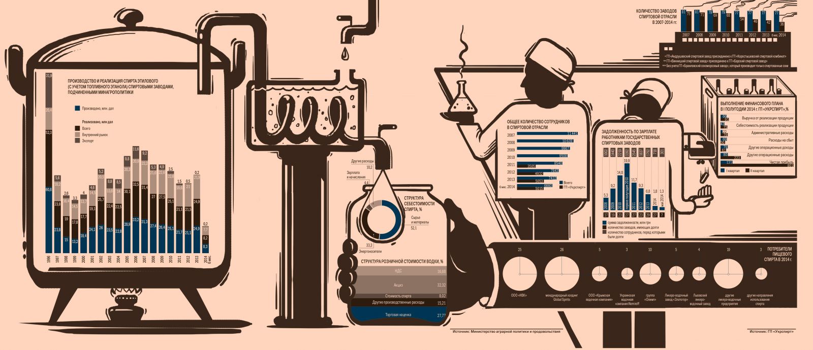 Согласно данным Минагрополитики, на сегодняшний день мощности заводов по производству спирта составляют 58,3 млн дал. Однако на практике объемы производства в два раза меньше — 24,9 млн дал в 2013 г. — и продолжают сокращаться. В министерстве тенденцию объясняют тем, что поскольку спирт этиловый не относится к потребительским товарам и является сырьем для производства других товаров (алкоголя, лекарств, кондитерских изделий, ветеринарных препаратов, уксуса и пр.), объемы его производства и реализации зависят от спроса. При этом львиную долю спирта — 80 % — потребляют производители алкогольных напитков, изготовление которых в 2010‑2013 гг. сократилось практически на 34 %. Это в свою очередь привело к снижению на 40 % производства и реализации спирта этилового.