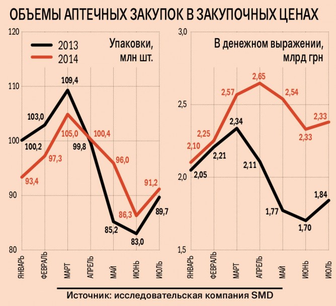 Подорожание лекарств вызвала резкая девальвация гривни, она же стала одной из основных причин падения продаж. По данным Нацбанка, с 3 января по 1 августа 2014 г. средневзвешенный курс гривни к доллару США на межбанковском валютном рынке вырос на 46,8 % — до 11,96 UAH / USD. По подсчетам SMD, с начала 2014 г. средневзвешенная стоимость упаковки импортного лекарства повысилась на 39,1 %, а отечественного — на 15,9 %. Украинские препараты также дорожают из‑за того, что используют импортное сырье для производства.