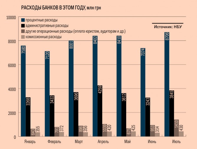 Большую долю в структуре расходов финучреждений занимают и административные затраты: в июле они увеличились на 19 % — до 3,8 млрд грн. Рост административных затрат произошел по двум основным причинам. «Первая — рост затрат на персонал: возможно, это влияние выплаты выходных пособий сокращенному персоналу. Вторая — девальвация гривни: приобретаемые бензин, транспорт, компьютерная техника, офисная бумага, бланки карт, серверы и многое другое — импортные», — рассказывает Войткив. На рост расходов повлияло и изменение тарифов на электроэнергию, которое вступило в силу в июле, отметил Ратувухери.