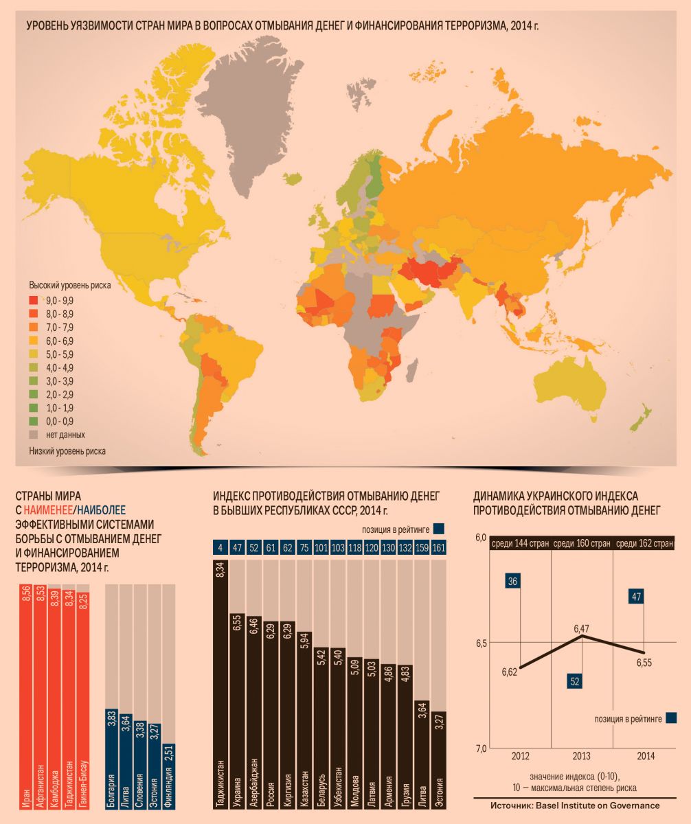 За последний год благодаря росту национального индекса (6,47 в 2013 г. против 6,55 в 2014 г.) Украина поднялась в глобальном списке сразу на пять позиций, расположившись в рейтинге между Кот-д’Ивуаром (6,60) и Пакистаном (6,53). Это свидетельствует о том, что отечественная система борьбы с отмыванием денег и финансированием терроризма стала менее эффективной. Среди 14 стран постсоветского пространства, охваченных исследованием, наше государство имеет один из худших результатов — более уязвимым в обезвреживании финансовых злодеев оказался только Таджикистан.