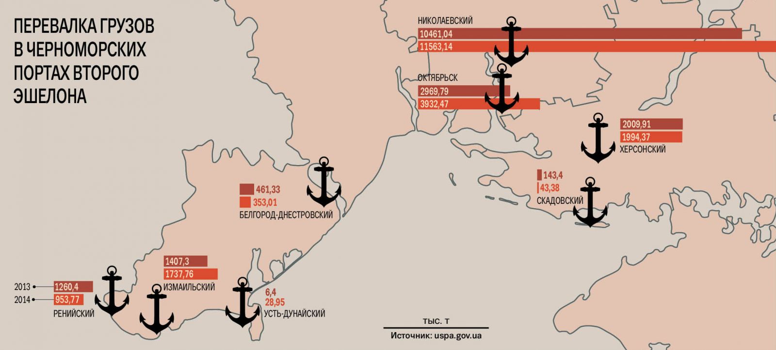 Сегодня в стране работают 8 портов второго эшелона, находящихся на Черноморском побережье: Усть-Дунайский (перевалка транзитных, внешнеторговых и каботаж­ных грузов, складские операции), Белго­род-Днес­тровский (зерновые, лесные, генеральные грузы, живой скот, минерально-строительные материалы), Ренийский (генеральные и навалочных грузы, автомобили) Ска­довский (грузопассажирские и автопаром­ные перевозки), Херсон­ский (генеральные, навалочные и насыпные грузы), Измаильский (генеральные, навалочные грузы, контейнеры), Николаевский (черные и цветные металлы, руда, окатыши, ферро­сплавы, глина, удобрения навалом, зерно и продовольственные грузы) и СМП «Ок­тябрьск» (генеральные грузы).