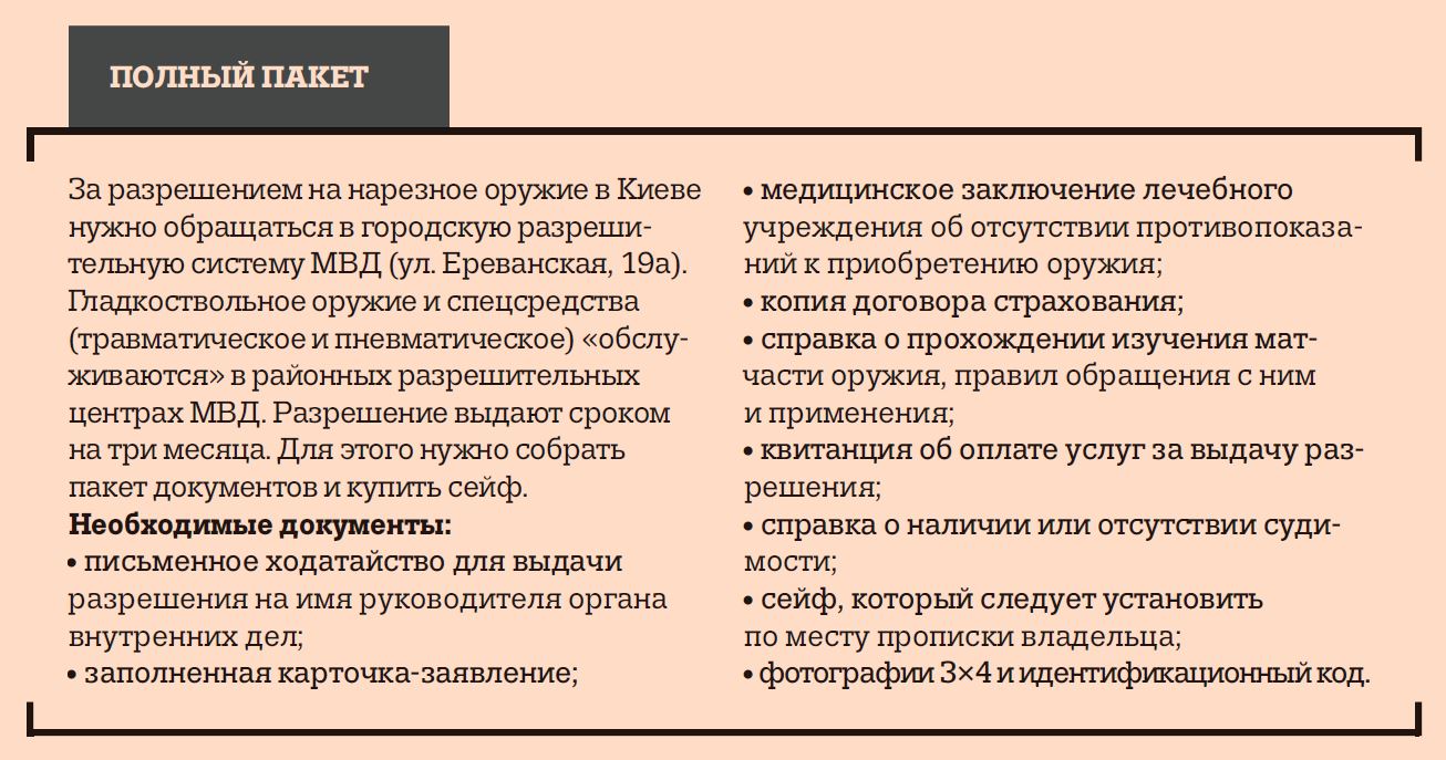 Стрелок-любитель Сергей Прохоренко советует указывать в качестве цели приобретения нарезного оружия спортивную стрельбу. «Насчет охоты вам справедливо заметят, что с нарезным в Киевской области особо охотиться не на что», — отмечает он. Спустя месяц после подачи документов и оплаты госпошлин можно забирать разрешение. «С ним уже можно идти в охотничий магазин. После продажи там обязаны вернуть корешок от разрешения. Также в торговой точке могут дать (но не обязаны) опечатанный конверт с отстрелянными пулями и гильзой для пулегильзотеки МВД. В противном случае придется ехать еще в экспертную службу (в Киеве — ул. Владимирская) для отстрела, — поясняет Прохоренко. — Затем нужно посетить городскую разрешительную систему МВД, отдать конверт с пулями и корешок, показать оружие для сверки номера, оплатить еще одну квитанцию. Уже через две недели можно забрать пластиковое разрешение на хранение и ношение». Страховка, госпошлина, справки, само разрешение и прочие документы обойдутся в сумму, не превышающую 1100 грн.