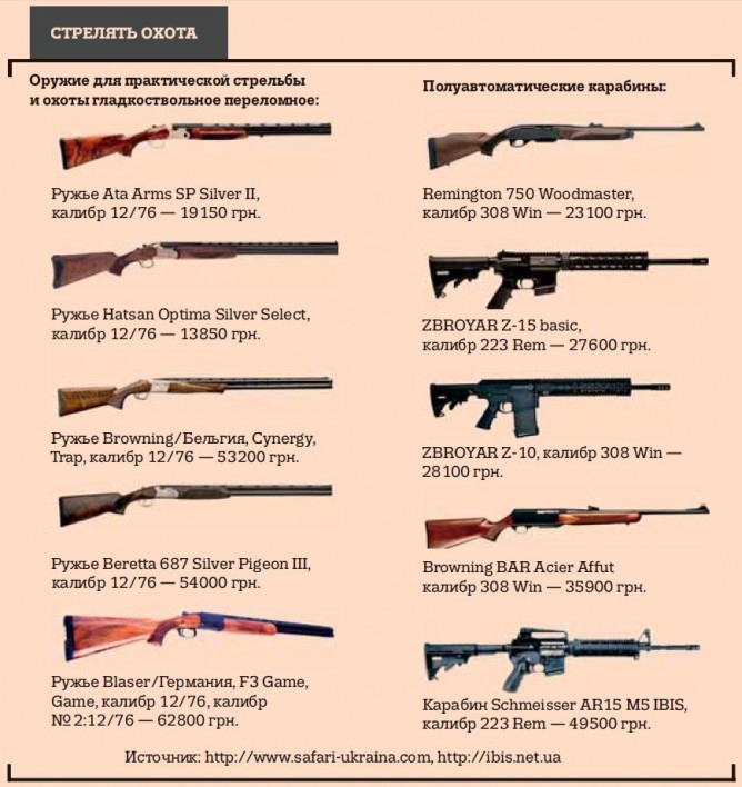 Основные виды стрелкового оружия — нарезное и гладкоствольное. По словам директора оружейного салона «Сафари — Украина» Игоря Козловского, спортивное гладкоствольное оружие разделяют на два вида: для стрельбы по тарелкам (skeet, trap, sporting) и для практической стрельбы. В первом случае используется переломное или полуавтоматическое калибром 12 / 70. Наиболее часто встречающиеся модели — Blaser F3, Beretta (DT10 и 682), Browning (Cynergy, B725 Sporter, Maxus Sporting). Для практической стрельбы применяется помповое или полуавтоматическое гладкоствольное оружие калибра 12 / 76 с коротким стволом 47 см или 51 см. Наиболее яркие представители — Benelli во всех тактических исполнениях (М2, М4, Nova), Fabarm SDASS, Сайга 12, Mossberg 500 Cruiser, Mossberg (590A1 и 930), Maverick 88 Cruiser / Security, Remington 870.