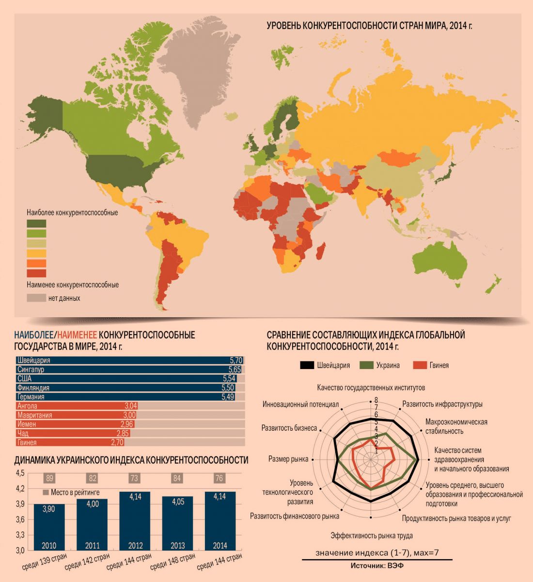 За последний год украинский индекс конкурентоспособности немного вырос (4,14 балла в 2014 г. против 4,05 балла в 2013 г.), вернувшись на уровень 2012 г. Это позволило Украине расположиться в нынешнем рейтинге между Словакией (4,15) и Хорватией (4,13). Однако, по мнению ВЭФ, для обеспечения стабильного экономического развития нашей стране в первую очередь необходимо провести реформы, направленные на увеличение эффективности работы государственных институтов (130‑я позиция в рейтинге).