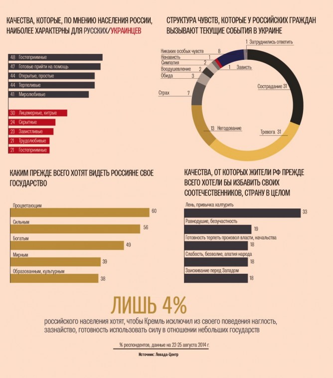 Почти каждый третий (30 %) житель Российской Федерации уверен: представители украинского этноса полны хитрости и лицемерия. Эти качества оказались наиболее распространенными среди российских граждан при составлении характеристики украинского народа. В то же время практически половина (48 %) населения РФ назвала гостеприимство качеством, которое лучше других характеризует русских. Таковы результаты исследования общественного мнения населения России, проведенного 22‑25 августа 2014 г. аналитической организацией «Левада-Центр». Информацией для экспертов послужили итоги опроса 1,6 тыс. совершеннолетних граждан, проживающих в 134 населенных пунктах из 46 регионов РФ.