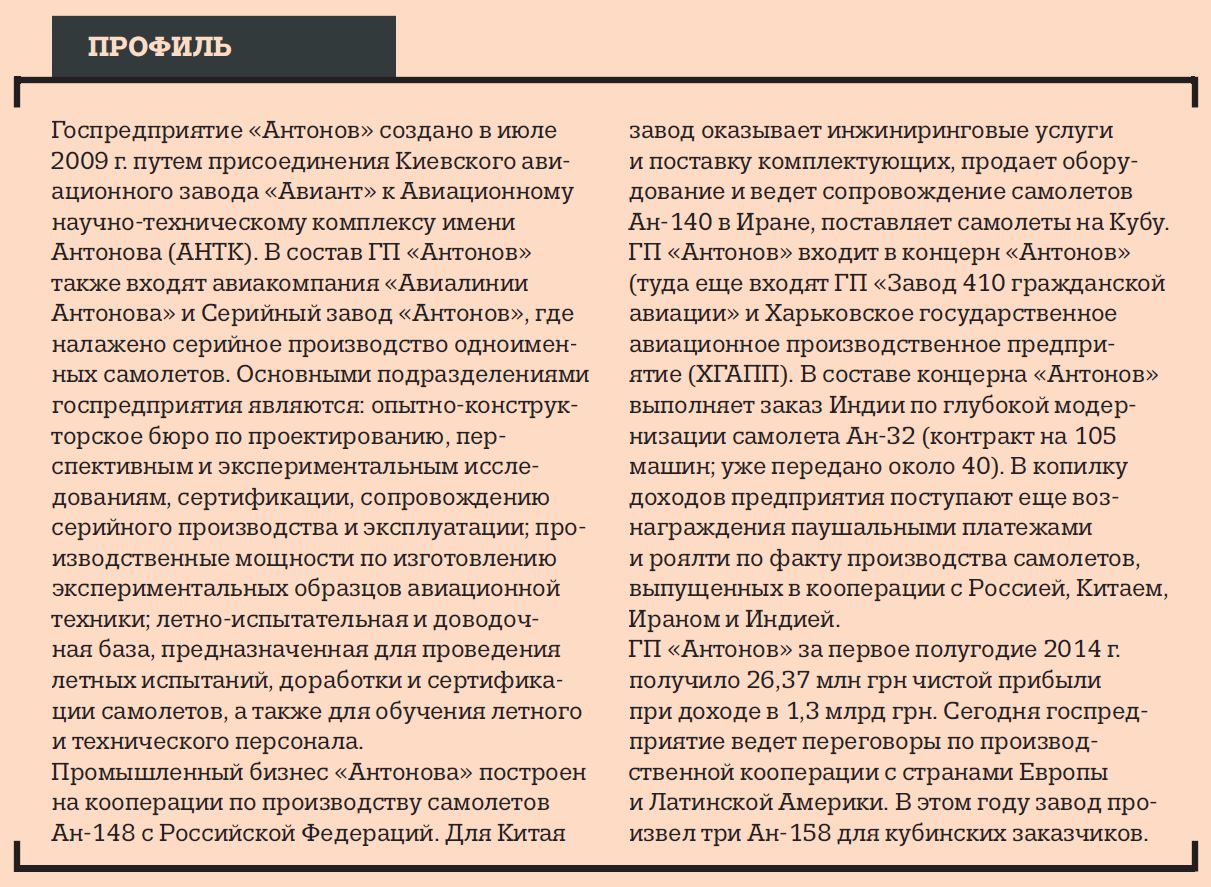 Тем не менее, смена менеджера «Антонова» необходима, считают опрошенные «Капиталом» участники рынка и отраслевые эксперты. Глава набсовета компании «Мотор Сич» Анатолий Малыш говорит, что у его предприятия как партнера «Антонова» нет претензий к руководству завода, в том числе к Дмитрию Киве. По его словам, Дмитрия Киву должны оставить на позиции генконструктора, а топ-менеджерскую позицию на госпредприятии необходимо усилить, так как основная задача ГП «Антонов» — строить и продавать самолеты, но пока что результаты компании достаточно слабые. С ним соглашается старший аналитик инвестгруппы «АРТ Капитал» Алексей Андрейченко, добавляя, что завод держится на плаву за счет доходов авиаперевозчика «Авиалинии Антонова», а не от производственной деятельности. По словам аналитика, от завода ждут строительства самолетов в больших объемах, но компания фактически за 5 лет произвела около 12 машин, тогда как точка безубыточности в промышленном производстве, по оценкам самого ГП, составляет 10‑12 самолетов в год. По ранее оглашенным Сергеем Меренковым данным, на сегодняшний день ГП «Антонов» получает 70‑80 % дохода именно от авиаперевозок.