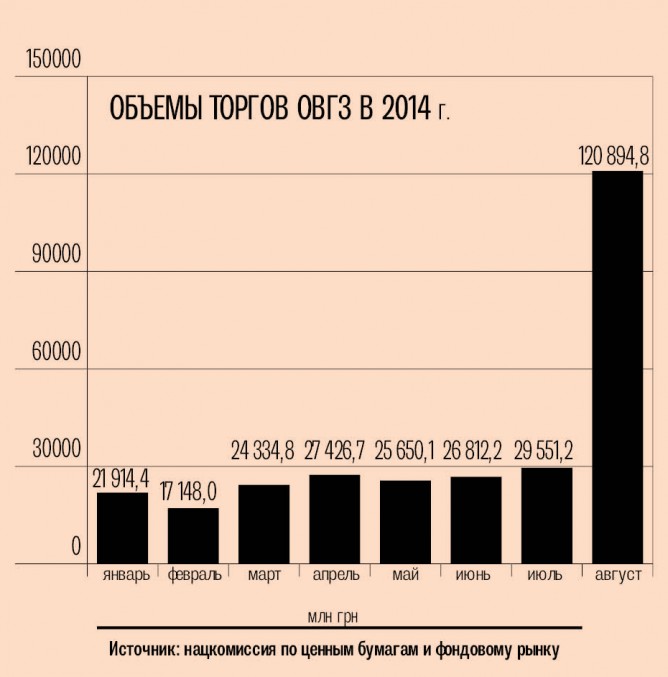 В августе объем торгов гос­облигациями внутреннего госз­­­айма (ОВГЗ) на биржах достиг своего исторического максимума. Всего за один месяц банки и торговцы заключили сделок с такими бумагами на 120,8 млрд грн, со­­общила Национальная комиссия по ценным бумагам и фондовому рынку (НКЦБФР). Для сравнения: объем торгов госбумагами на биржах за 2011 год составил 99,1 млрд грн.