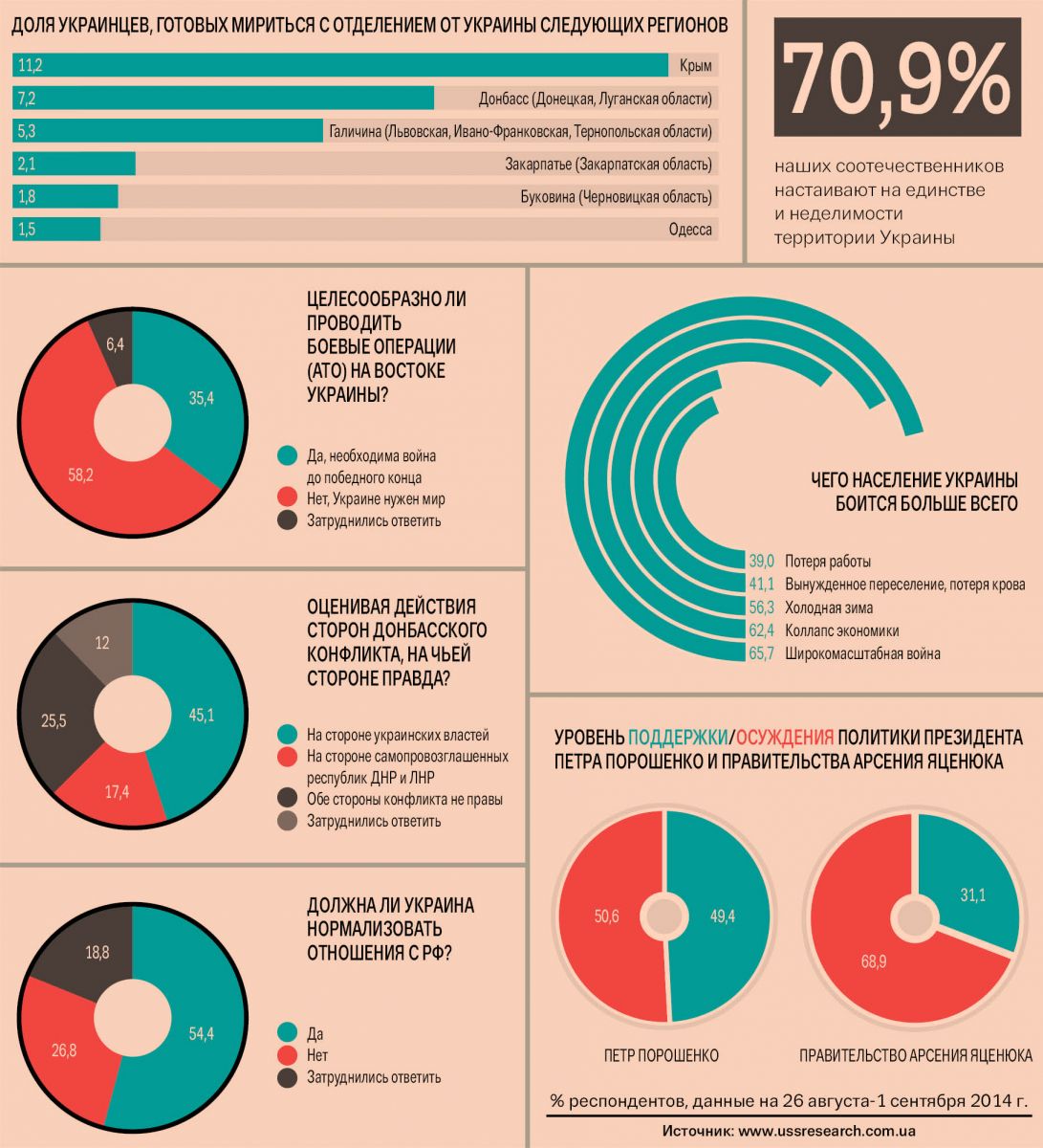 Более половины (58,2 %) соотечественников являются противниками продолжения АТО на востоке и требуют восстановления мира на территории Украины. Такая позиция общественности не выглядит неожиданностью, поскольку главным страхом населения Украины, преследующим почти две трети (65,7 %) респондентов, оказалось развязывание широкомасштабной войны. Таковы результаты исследования гражданской позиции украинцев, проведенного с 26 августа по 1 сентября 2014 г. исследовательской компанией «Ю. С. С.». Информацией для анализа стали итоги опроса 1,8 тыс. совершеннолетних жителей со всех регионов Украины, за исключением АР Крым и Луганской области.