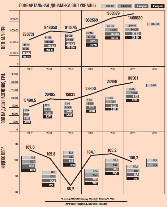 В зависимости от показателей последнего квартала по итогам года экономический рост в Украине составит от  -0,5 % до +1 %, считают опрошенные «Капиталом» эксперты. Минфин в июне ухудшил прогноз роста ВВП Украины в 2013 г. до 1‑1,5 %. А значит, рост будет намного ниже заложенного в госбюджет в размере 3,4 %.