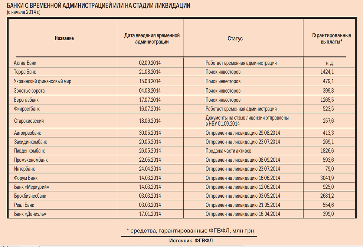С начала года ФГВФЛ уже ввел временные администрации в 17 финструктур, из них уже 10 ликвидированы (см. инфографику). Причем только по этим десяти банкам Фонд гарантирования вкладов физлиц должен выплатить 9,2 млрд грн. А общая сумма депозитов, гарантированных фондом в банках с временной администрацией, не считая Актив-Банка, уже составила 15,1 млрд грн. Из них около 1,8 млрд грн выплатит вместо фонда Фидобанк, который приобрел активы и пассивы Пивденкомбанка. Остальные деньги ФГВФЛ придется искать самостоятельно, если он не сможет найти покупателей на оставшиеся семь неплатежеспособных финучреждений.