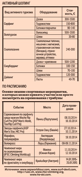 Не стоит забывать и о костюме. Тут разброс цен зависит от марок и толщины обмундирования. Цены стартуют от 150 евро (вполне приемлемо для новичка) и достигают 800‑1000 евро. Средняя стоимость хорошего гидрокостюма толщиной в 2‑3 мм составляет 300‑400 евро. Для зимнего серфинга нужны перчатки, ботинки, капюшон. А это еще около 140‑200 евро. «Зимой я рекомендовал бы ехать в Ирландию — Бундоран, Марокко — Тарадут, Канарские острова — Фуэртевентура, Капо Верде — Понте Прета», — советует Мэйлес. Авиаперелет на эти курорты обойдется в 400‑1000 евро. Проживание, в зависимости от страны, — 50‑120 евро в сутки за номер.