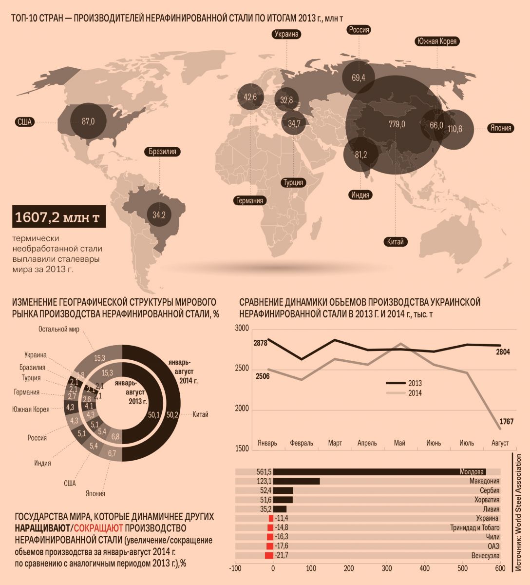 По сравнению с прошлогодними результатами снижение производства украинской стали наблюдалось в каждом отдельном месяце 2014 г., за исключением мая. А пиком падения стал предыдущий месяц, когда наши сталевары произвели на 37 % меньше продукции, чем в августе 2013 г. Результатом сокращения производственных мощностей для Украины стала потеря 0,3 % мирового рынка.