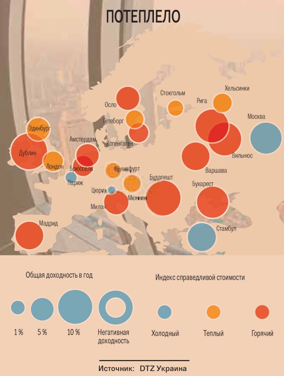 Компания «DTZ Украина» ежеквартально готовит отчет о наиболее недооцененных рынках Европы (см. инфографику). Индекс справедливой стоимости позволяет инвестору сориентироваться — инвестируя в Румынии, Ирландии, Венгрии или Балтике, он получит возврат на уровне 10 % годовых исходя из 5‑летнего периода инвестиции. Так можно расплатиться по кредиту благодаря арендной плате, после чего продать объект по возросшей за это время рыночной цене. «Холодными» рынками считаются те, где цены на недвижимость находятся на исторических максимумах и уверенности в росте стоимости объектов нет. «Горячие» — это локации с недооцененной на сегодня стоимостью и высоким потенциалом роста.