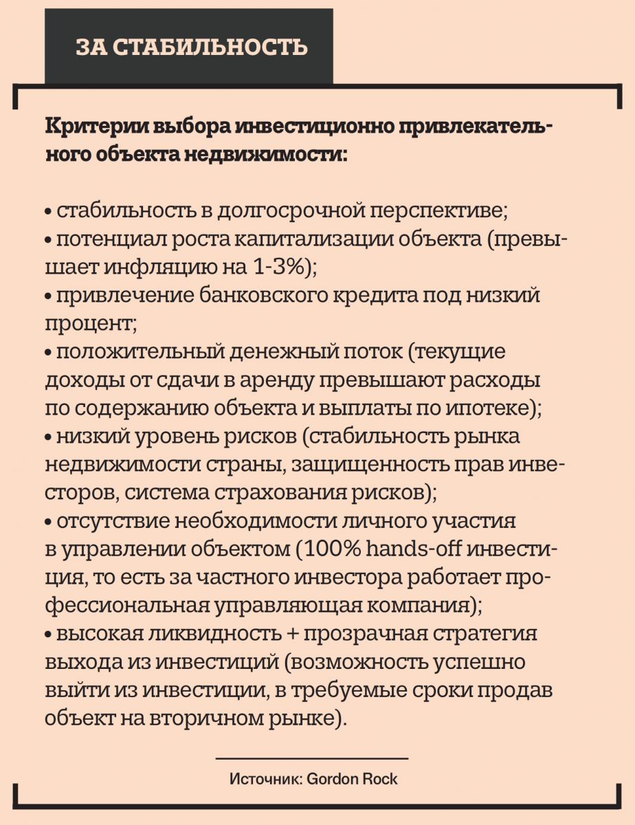 В рейтинге инвестиционной привлекательности в Европе сегодня лидируют Германия, Великобритания, Франция и Швейцария, а также США — страны с сильнейшими экономиками и высоким уровнем защиты инвесторов, в том числе и нерезидентов. Объекты жилой и коммерческой недвижимости здесь имеют высокую ликвидность. Благодаря доступности кредитования с фиксированными ставками 2,5‑4,5 % и достаточно высокому и нередко гарантированному арендному доходу, инвесторы вполне могут рассчитывать на инвестиции с рентабельностью 8‑14 % годовых. Дело в том, поясняет Зингель, что продавец может гарантировать определенный процент заполнения площади арендаторами, а это автоматически означает получение стабильного дохода. В случае привлечения кредита для приобретения объекта, например в странах Западной Европы, достаточно 40‑50 % собственных средств, говорят эксперты.
