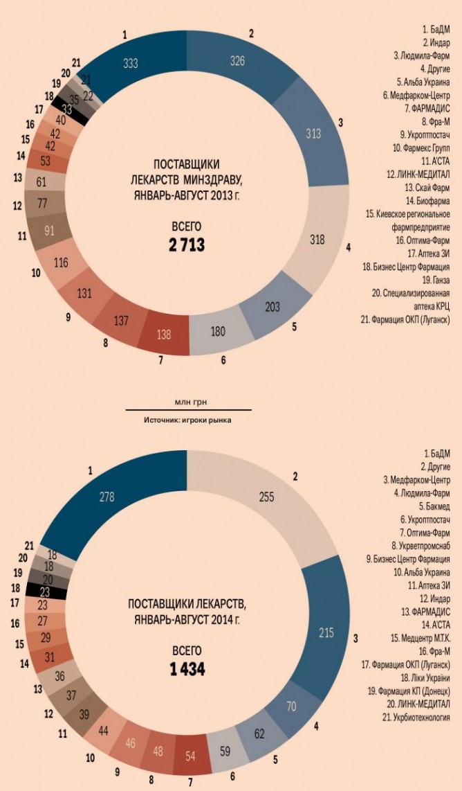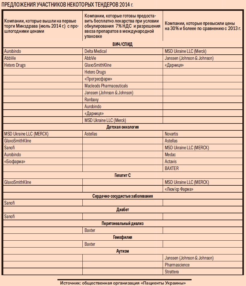 После объявления в июне первых тендеров вскрылась другая проблема — цены, по которым компании предлагали поставлять лекарства, оказались выше, нежели мог себе позволить Минздрав. Например, на 4 августа были открыты предложения на общую сумму около 940 млн грн. В среднем стоимость лекарств оказалась на 50 % выше, чем в прошлом году. Напомним, на этот год для госзакупок лекарств запланировано в госбюджете 2,2 млрд грн, что соответствует финансированию 2013 г. Но с начала года национальная валюта девальвировала на 58,8 %, как свидетельствуют данные Национального банка. «По тем ценам, которые предлагали поставщики, мы не могли закупить необходимый объем лекарств», — сетует Виктор Сальков. Поэтому летом Кабмин своим постановлением разрешил Минздраву уменьшить объем закупок.