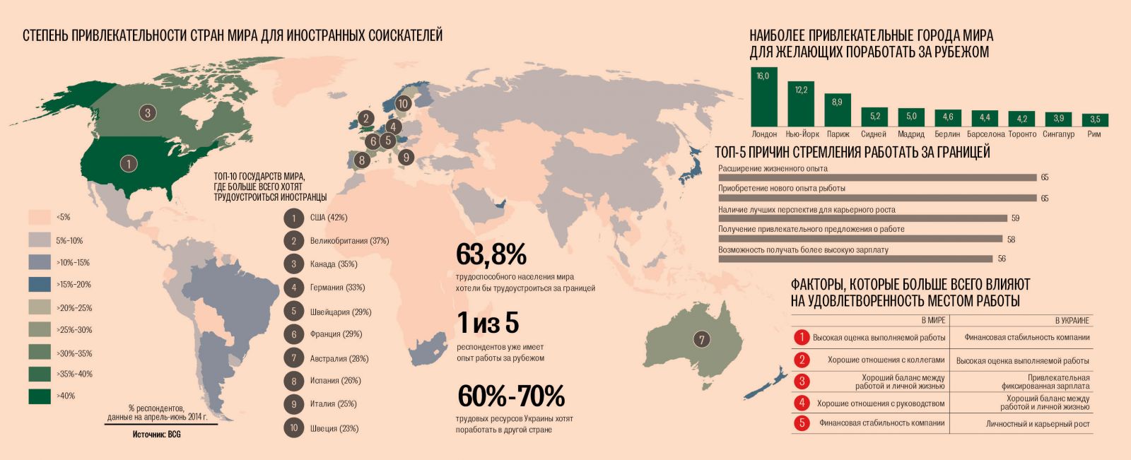 Более половины (60‑70 %) трудоспособного населения нашей страны изъявляют желание поработать за границей. Таковы данные отчета «Decoding Global Talent: 200,000 Survey Responses on Global Mobility and Employment Preferences», подготовленного транснациональной компанией The Boston Consulting Group (BCG) совместно с международным альянсом The Network, объединяющим более чем 50 ведущих сайтов по поиску работы и подбору персонала. Информацией для анализа послужили итоги проведенного с 29 апреля по 10 июня 2014 г. опроса более 200 тыс. соискателей из 189 стран мира. Цель исследования — оценить уровень желания экономически активного населения планеты работать за рубежом, определить наиболее привлекательные для трудоустройства государства и города мира, а также выявить факторы, которые подталкивают к трудовой миграции и способствуют удовлетворенности местом работы. Согласно социологическим данным, почти две трети (63,8 %) экономически активных жителей мира готовы переехать в другую страну с целью трудоустройства.