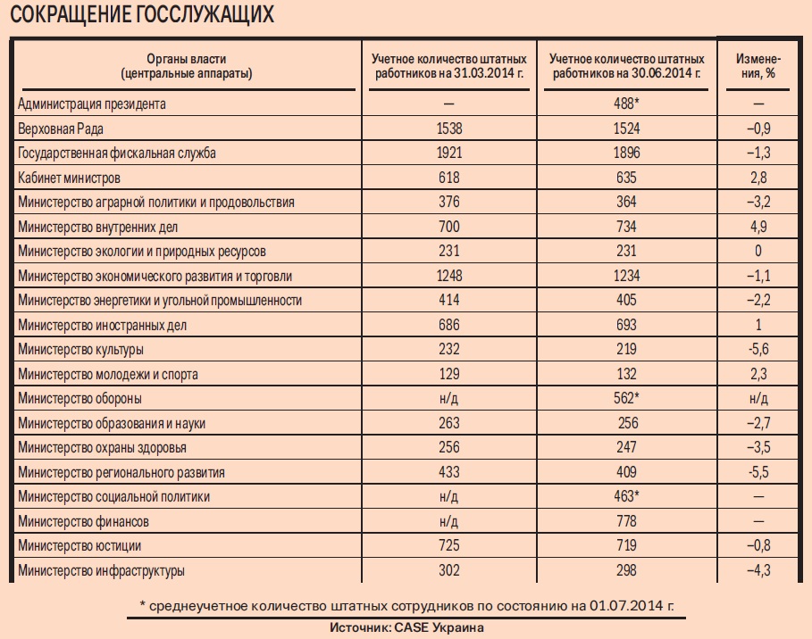 Неправительственный центр социально-экономических исследований «CASE Украина» провел исследование, как центральные органы власти реализуют решение правительства о сокращении госаппарата. «Полгода назад, выступая в Раде, Яценюк пообещал на 10 % сократить численность органов исполнительной власти. Мы направили запросы в органы центральной власти с просьбой указать количество штатных сотрудников на конец марта и на 30 июня — спустя три месяца, после выступления премьера», — рассказала «Капиталу» координатор исследования «CASE Украина» Юлия Шибалкина. По ее словам, полученные данные продемонстрировали, что ни одно министерство не смогло сократить штат более чем на 5,6 %. При этом в ряде ведомств количество чиновников выросло. Увеличился штат и самого центрального аппарата Кабмина. «Полученные результаты говорят, что обещанные реформы не проводятся. То есть мы видим не только экономический популизм, но и политический», — подчеркнула Шибалкина.