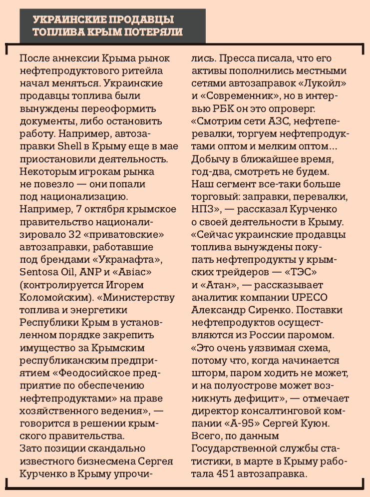 Резкое удорожание отпугивает покупателей. За девять месяцев было продано 2,9 млн т топлива, свидетельствуют данные Государственной службы статистики. Для сравнения: в прошлом году за аналогичный период реализовали 3,2 млн т. Потребители переориентируются на дешевую продукцию. Например, «приватовские» заправки (работают под брендами «Укрнафта», ANP, «АВИАС плюс», Sentosa Oil и др.), продающие бензин марки А-95 на гривню дешевле среднерыночной цены, с января по сентябрь увеличили долю рынка на 6,5 п. п. — до 34 %.