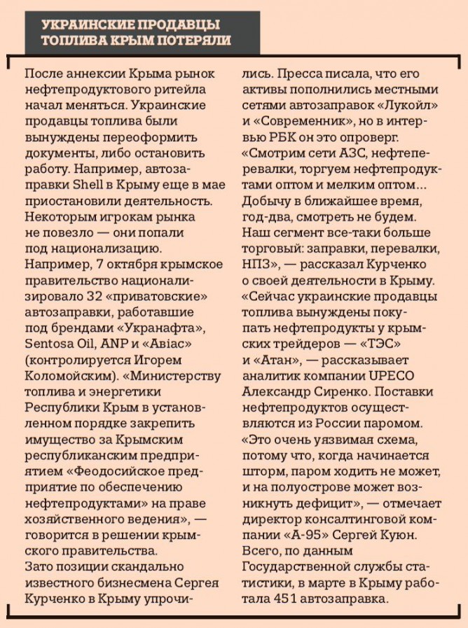 В этом году речь не идет о развитии, главное выжить, считает президент ассоциации «Объединение операторов рынка нефтепродуктов Украины» Леонид Косянчук. «Сложнее всего приходится мелким сетям. У них есть два варианта: либо продаваться, либо бодяжить», — признает он. По информации Куюна, доля фальсификата на рынке составляет 20 %. Основные области, в которых наблюдается высокая концентрация суррогата, — Луганская, Донецкая, Харьковская, а также Крым. По словам эксперта, в этом году научились подделывать не только бензин, но и дизельное топливо, куда добавляют авиационный керосин.