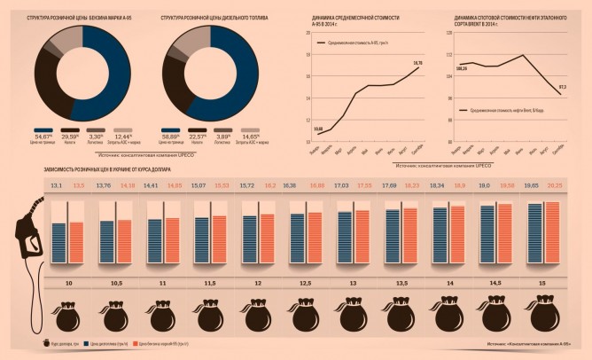 Основной причиной удорожания нефтепродуктов эксперты называют девальвацию гривни и увеличение фискальной нагрузки. С начала года было несколько ценовых скачков. Пик пришелся на конец зимы — начало весны. Первый ры­вок про­и­зо­шел 25‑27 февраля, когда большинство автозаправок подняли стоимость топлива на 40‑60 коп. за литр. Именно в этот период национальная валюта подешевела с 9,4 UAH / USD до 10 UAH / USD.