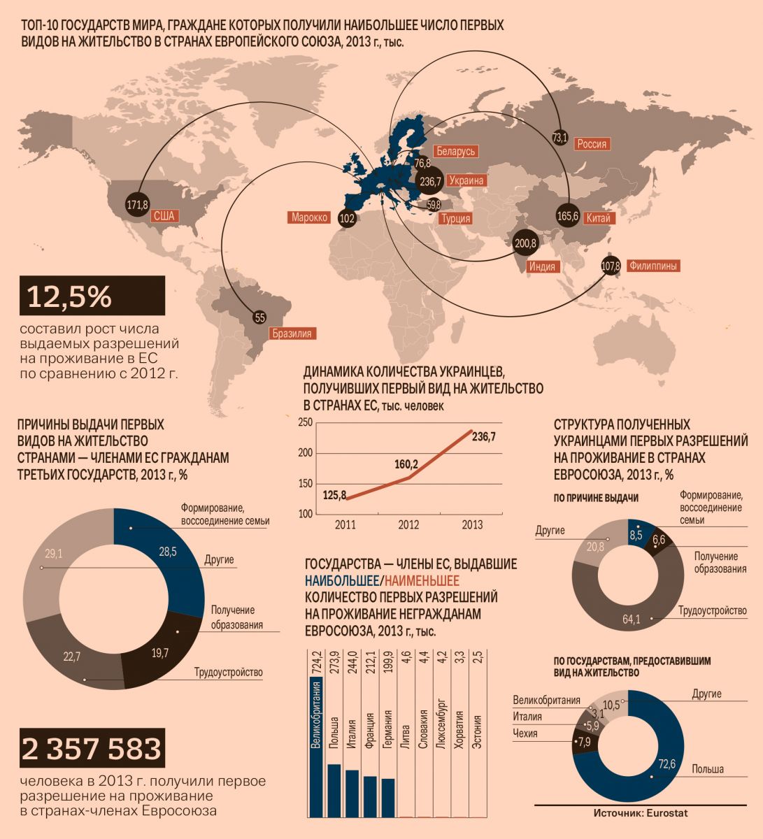 По итогам 2013 г. страны — члены Европейского союза выдали первое разрешение на проживание на своей территории 236,7 тыс. наших соотечественников, что на 76,5 тыс. больше, чем в 2012 г. Таким образом, Украина второй год кряду возглавляет глобальный список государств, граждане которых получают наибольшее количество видов на жительство от Евросоюза. Таковы данные, опубликованные статистической службой ЕС — Eurostat.