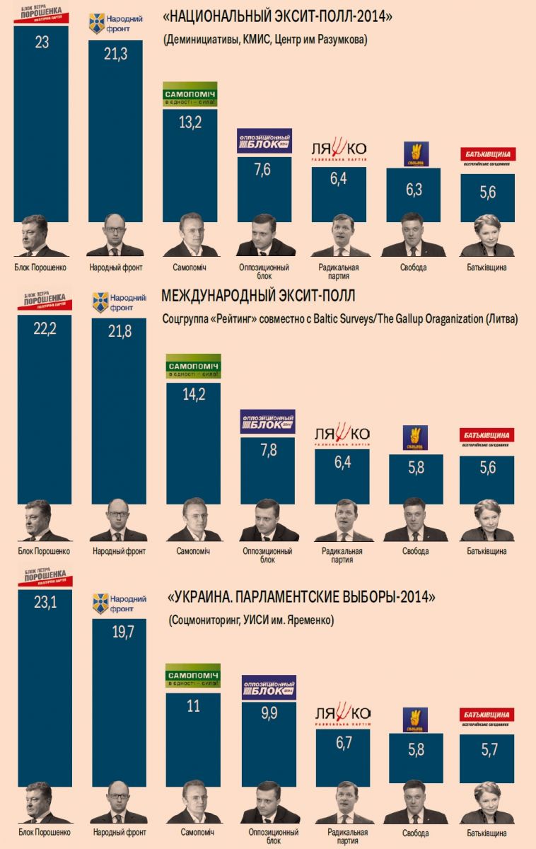 Согласно данным эксит-поллов, в Верховную Раду VIII созыва проходит семь партий. Наибольшее количество голосов, как и прогнозировалось, получила по партийному списку партия «Блок Петра Порошенко». Однако ее результат оказался меньше, чем рассчитывали в избирательном штабе. «Мы не смогли сохранить мобилизационный эффект, который дали президентские выборы. Но трагедии мы в этом не видим. На переговоры о создании коалиции послевыборный расклад не повлияет», — сказал «Капиталу» член политсовета БПП Юрий Стець. По его словам, главный партнер БПП в создании парламентской коалиции — «Народный фронт».