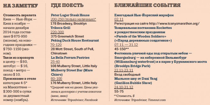 «Будь то роскошный ресторан или маленькая забегаловка, ты гарантированно получишь вкусную еду и отличное обслуживание. Не стоит забывать о Chelsea Market, где за $ 17 вы попробуете блюдо из свежайших устриц и крабов или лобстера за $ 30», — рассказывает «Капиталу» директор компании «GoodFood» Руслан Терещенко, который в мае этого года с женой ездил в Нью-Йорк в гастротур. Подобная поездка обходится в $ 3‑4 тыс. на человека с перелетом, питанием, дегустациями и гостиничным номером на Манхэттене.