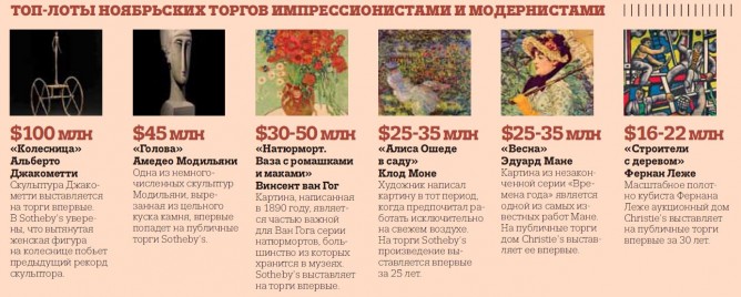 К примеру, на вечерних торгах импрессионистами и модернистами в мае нынешнего года два ведущих аукционных дома выручили почти $ 505 млн — на $ 70 млн больше, чем на вечерних торгах в этом же сегменте в ноябре прошлого года. На нынешних торгах Sotheby’s и Christie’s выставляют такие внушительные лоты, что продажи обещают побить все рекорды последних лет.