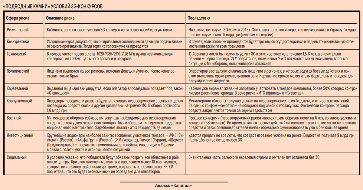 Пожалуй, гораздо более серьезные риски срыва 3G-конкурса могут касаться вовсе не потенциального противостояния Кабмина и НКРСИ, а самих участников конкурса. Не исключено, что в последние дни перед вскрытием конвертов окажется, что желающих получить лицензии вовсе не пять («Киевстар», «МТС Украина», life:), «Укртелеком», «Интертелеком»), как это было летом при изучении предварительного спроса. И не три, как рассчитывал Кабмин и НКРСИ в начале осени. А еще меньше.