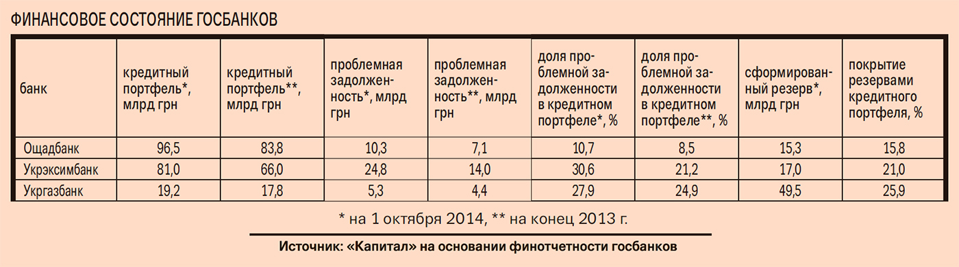 На самом деле ситуация в госбанках может быть и хуже, чем они показывают в отчетности. Нередко финучреждения идут на уловки, рефинансируя проблемные займы. Это позволяет не относить плохие кредиты в проблемную категорию, а значит, не доформировывать резервы. Как заявил первый зампредседателя НБУ Александр Писарук, все три госбанка надо докапитализировать на 12,5 млрд грн. Причем львиная доля от этой суммы потребуется Ощадбанку.