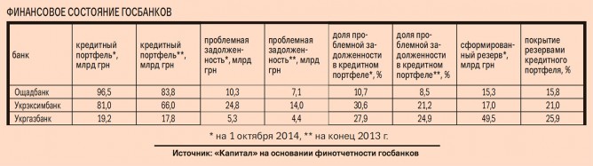 Все три крупнейших государственных банка — Ощадбанк, Укрэксимбанк и Укргазбанк — с начала года синхронно увеличили долю проблемных кредитов. Это следует из финансовой отчетности финучреждений за III квартал. На 1 октября общая сумма просроченной задолженности в этих госбанках достигла 40,4 млрд грн, или более 20 % от объема их кредитного портфеля. Это больше, чем в целом по банковской системе. Согласно данным Нацбанка, по состоянию на 1 октября доля просроченных кредитов, выданных украинскими банками, составляла 11,5 %. Причем на начало года этот показатель был 7,7 %.