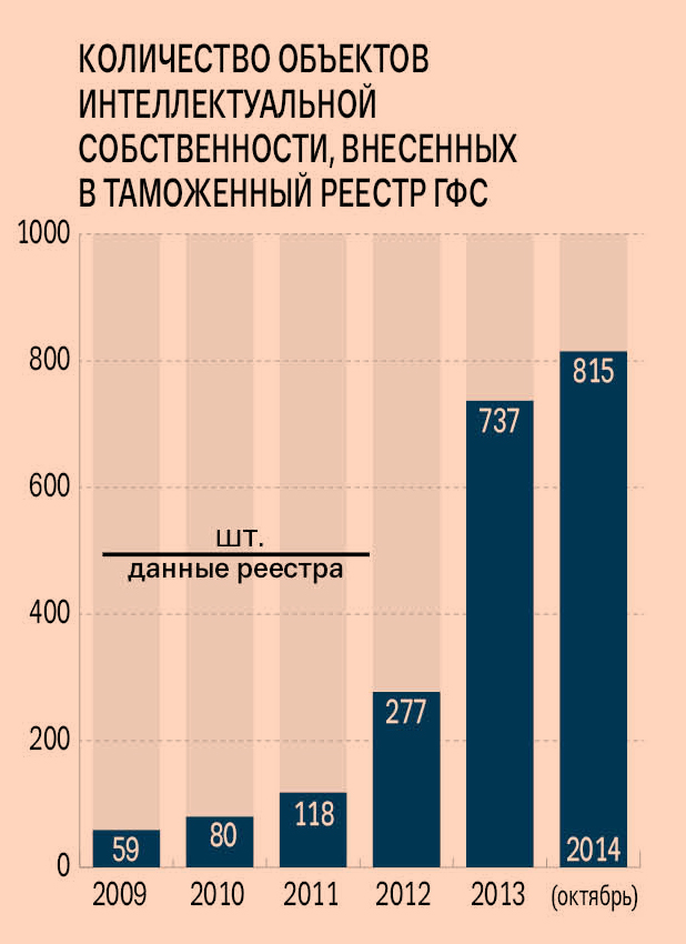 Такое количество обращений в этом году наблюдается неспроста, сходятся во мнении юристы, опрошенные «Капиталом». ГФС ведет таможенный реестр объектов права интеллектуальной собственности (изобретения, полезные модели, промышленные образцы, торговые марки, географические указания и пр). Как выяснил «Капитал», в 2013‑2014 гг. в этот реестр было внесено рекордное количество объектов — более 1550. А всего в список включено 2198 объектов. «По моим оценкам, в таможенном реестре около 700 записей о промышленных образцах сделаны с явно недобросовестными целями, а именно — чтобы препятствовать хозяйственной деятельности лиц, перемещающих через границу товары», — заявила партнер AstapovLawyers International Law Group Наталья Мещерякова.