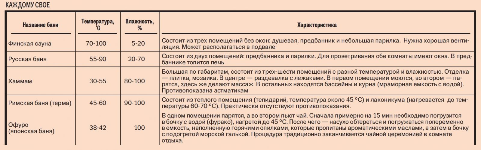 Сталкиваться с мифами и небылицами приходится уже при выборе вида бани. Вариантов существует множество: финская, русская, римская, турецкая — хаммам, японская — офуро и т. д. «Многие считают, что если здание построено из сруба, а внутри есть печь, то это русская баня. Но это не так. Основные критерии — температурный режим и уровень влажности», — рассказывает владелец компании «Имперей» Виктор Адаменко и сразу же уточняет, что сегодня строгого разделения между видами бань нет. Например, хаммам можно использовать как римскую баню.