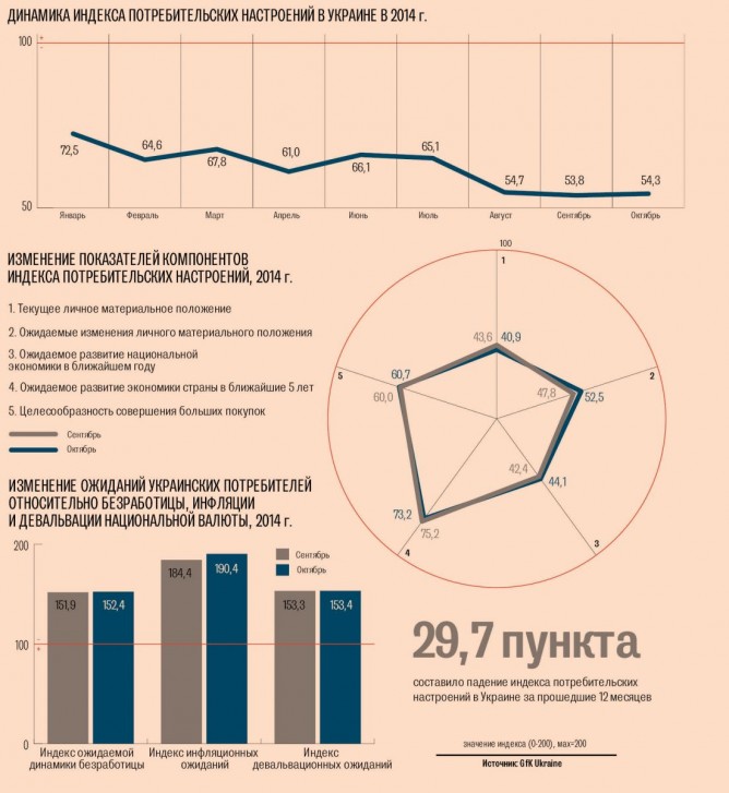 Впервые с июня текущего года индекс потребительских настроений граждан Украины продемонстрировал положительную динамику. Итоговое значение показателя по итогам прошлого месяца составило 54,3, что на 0,5 пункта лучше в сравнении с сентябрьским результатом. Таковы данные ежемесячного отчета «Потребительские настроения в Украине, октябрь 2014 г.», подготовленного исследовательской компанией GfK Ukraine. Информацией для экспертного анализа послужили итоги опроса 1 тыс. жителей материковой Украины не младше 16 лет.