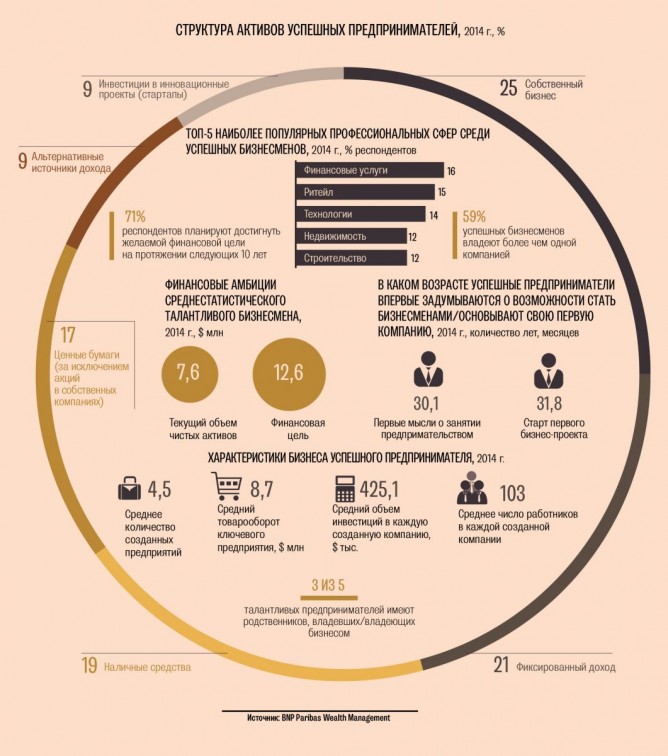 Каждый талантливый предприниматель нашей планеты, объем чистых активов которого составляет не менее $ 2 млн (без учета стоимости основного места проживания), в среднем создает или участвует в создании 4,5 бизнес-проектов. Наиболее усердны в этом плане бизнесмены Гонконга, где на каждого успешного предпринимателя в среднем приходится 10,2 созданных предприятия, в то время как на имя одного немецкого бизнесмена зарегистрировано всего 2,7 компании. Женщины немного активнее мужчин увеличивают количество своих предприятий: каждая бизнесвумен в среднем основывает 4,9 компаний (против 4,3 компаний на одного бизнесмена). Таковы данные отчета «2015 BNP Paribas Global Entrepreneurialism Report», подготовленного подразделением французского финансового конгломерата BNP Paribas — BNP Paribas Wealth Management — совместно с консалтинговой компанией Scorpio Partnership. Информацией для анализа послужили итоги опроса более 2,5 тыс. бизнесменов, представляющих 17 ведущих развитых и развивающихся экономик мира.