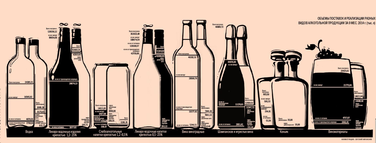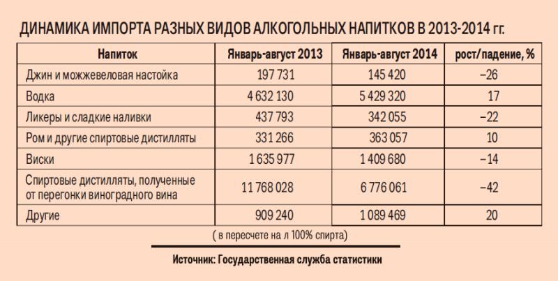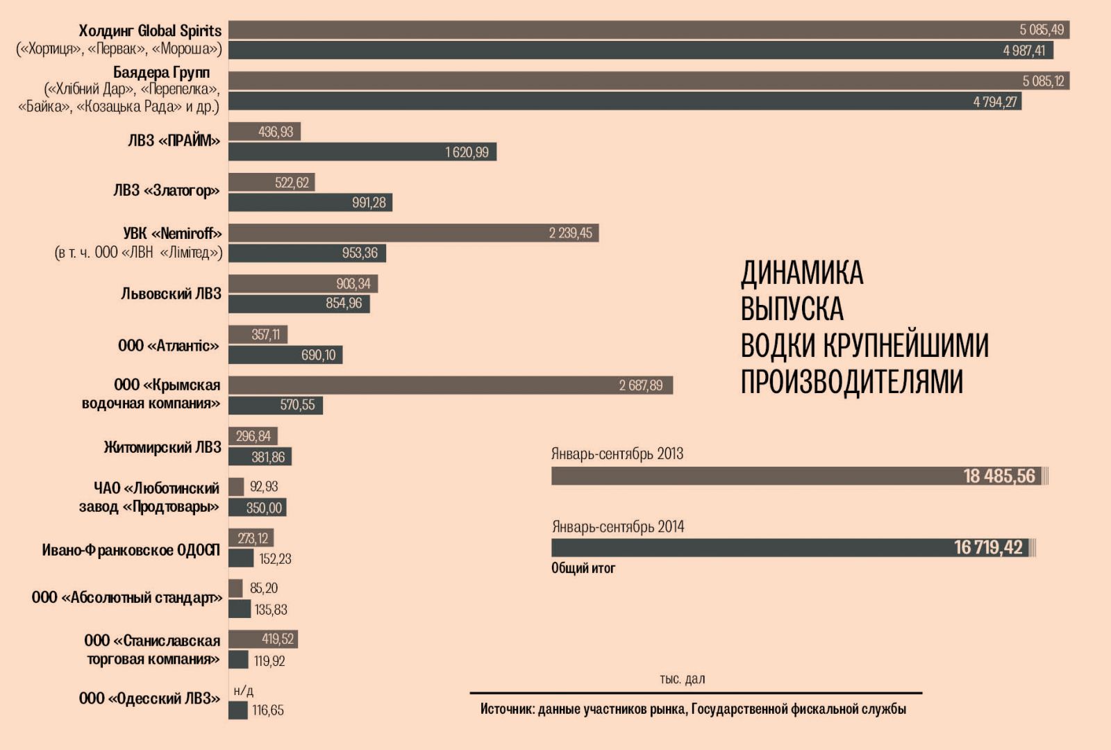 Регуляторные барьеры мешают работать украинским производителями алкоголя. «Состояние алкогольной отрасли постепенно стабилизируется», — рассказывает руководитель департамента маркетинга холдинга Global Spirits (торговые марки «Хортиця», «Мороша», «Первак», «Шустов») Александр Блохин. Однако восстановить возможно пока далеко не все алкогольные сегменты. В частности, по данным Государственной службы статистики, положительная динамика пока наблюдается только в производстве водки (занимает около 50 % в структуре продаж): объем ее производства вырос на 0,3 % — до 15,94 млн дал — за девять месяцев 2014 г. по сравнению с аналогичным периодом прошлого года. Данные подсчитаны без учета Севастополя и временно оккупированной территории Автономной Республики Крым. До этого производство водки стабильно падало — в январе-сентябре 2013 г. Госстат зафиксировал сокращение на 19,5 % по сравнению с первыми девятью месяцами 2012 г.
