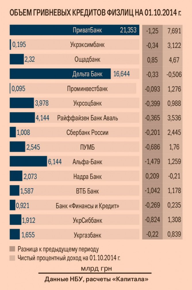 Объемы розничного кредитования в банковской системе значительно снизились с начала года. По данным НБУ, объем розничных кредитов в национальной валюте на 1 октября составлял 113,503 млрд грн, тогда как на начало года эта сумма была на 8,3 млрд грн больше. Среди крупнейших банков розничный кредитный портфель снизился у 13 из 15 финучреждений.