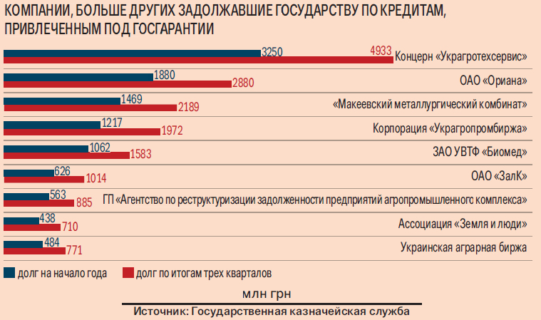 Чаще всего гарантии правительства под займ от международных финансовых организаций и банков получали госкомпании, тогда как запросы частных структур Кабмин удовлетворял реже. Тем не менее сложилась практика, когда предприятия получали кредиты, но не обслуживали их, отметил директор «CASE Украина» Дмитрий Боярчук. При этом, по словам эксперта, власти не утруждали себя анализом раздаренных ими поручительств. «Это только звучит хорошо, что с помощью госгарантий можно кого‑то поддержать. К тому же я не помню, чтобы правительство оценивало их эффективность после использования — возвращали деньги или нет», — объясняет собеседник.