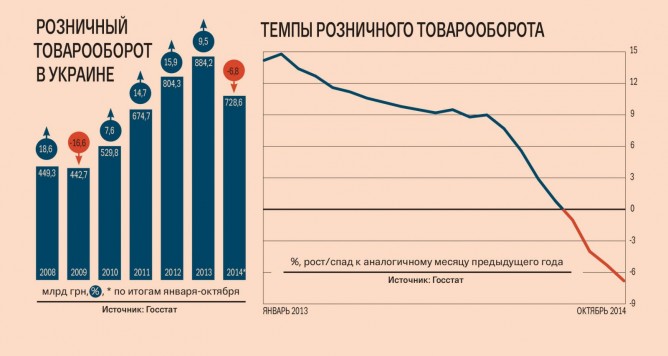 Впрочем, объем торговли падает не только здесь. Из отчета Госстата следует, что лишь семь регионов из 24 областей сохранили или приумножили темпы торговли по сравнению с прошлым годом, тогда как остальные 14 и Киев получили спад в продажах. Этому «способствовал» рост цен, спровоцированный обвалом гривни. С начала года индекс потребительских цен вырос на 19 %, тогда как, например, средняя зарплата — только на 9,5 %, до 3481 грн.