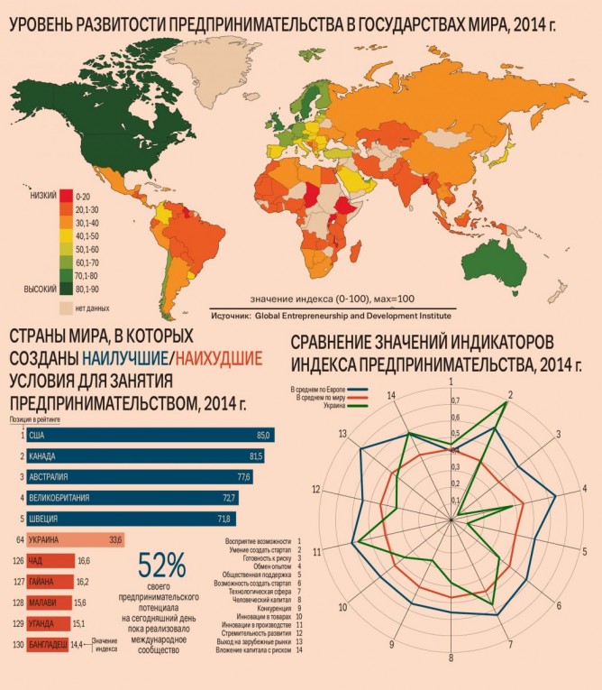 Украина по комфортности условий для осуществления предпринимательской деятельности расположилась в середине глобального, охватывающего 130 государств, рейтинга — на 64‑й позиции. Об этом свидетельствуют данные отчета «Global Entrepreneurship Index 2015», подготовленного экспертами американской исследовательской организации Global Entrepreneurship and Development Institute совместно с Global Entrepreneurship Network и опубликованного накануне старта ежегодной международной инициативы Global Entrepreneurship Week.