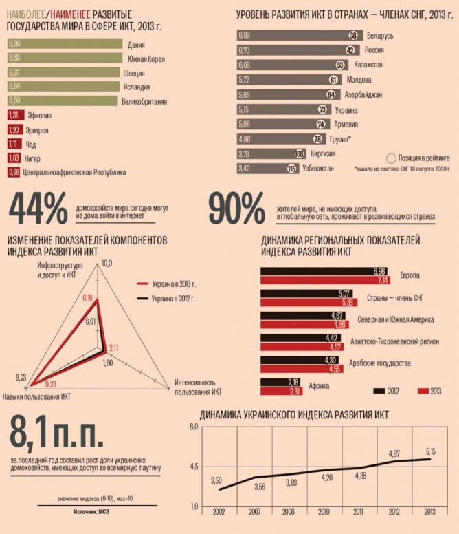 Значение украинского индекса ИКТ продолжило свой рост и по итогам 2013 г. зафиксировалось на отметке 5,15 балла, что позволило стране в текущем рейтинге расположиться между Сент-Винсентом и Гренадинами (5,17), а также Арменией (5,08). Но несмотря на постоянный прогресс, Украина все еще не дотягивает даже до среднего значения для стран — членов СНГ (5,33), лидером в развитии ИКТ среди которых сегодня является занимающая 38‑ю позицию мирового списка Беларусь (6,89).