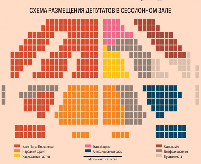 Представитель на переговорах «Народ­ного фронта» (НФ) Павел Пинзенык рассказал изданию, что вчера наибольшее недовольство своим расположением высказывали представители «Самопомочі». Депутат от этой политсилы Юрий Деревянко подтвердил, что их партия хотела бы сидеть там, где в Раде прошлого созыва располагалась фракция УДАР (сейчас место «Блока Петра Порошенко», БПП). А когда им отказали, то захотели места в центре сессионного зала — там, где должны сидеть депутаты Радикальной партии. Тогда таким предложением начал возмущаться ее лидер Олег Ляшко. В итоговом варианте «Самопоміч» заняла места, где в предыдущие годы располагалась фракция Коммунистической партии.
