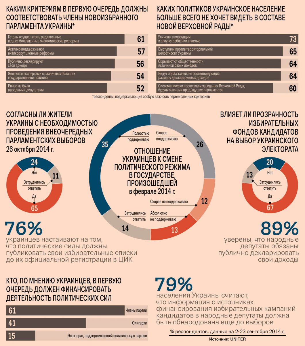Согласно социологическим оценкам, почти две трети (65 %) респондентов в целом поддержали решение власти провести внеочередные парламентские выборы 26 октября 2014 г. и только 24 % опрошенных высказались против необходимости незапланированного избрания новых законодателей. Стоит отметить, что 22 % граждан Украины в принципе не верят в то, что внеочередное волеизъявление сможет сыграть роль катализатора положительных изменений в стране.