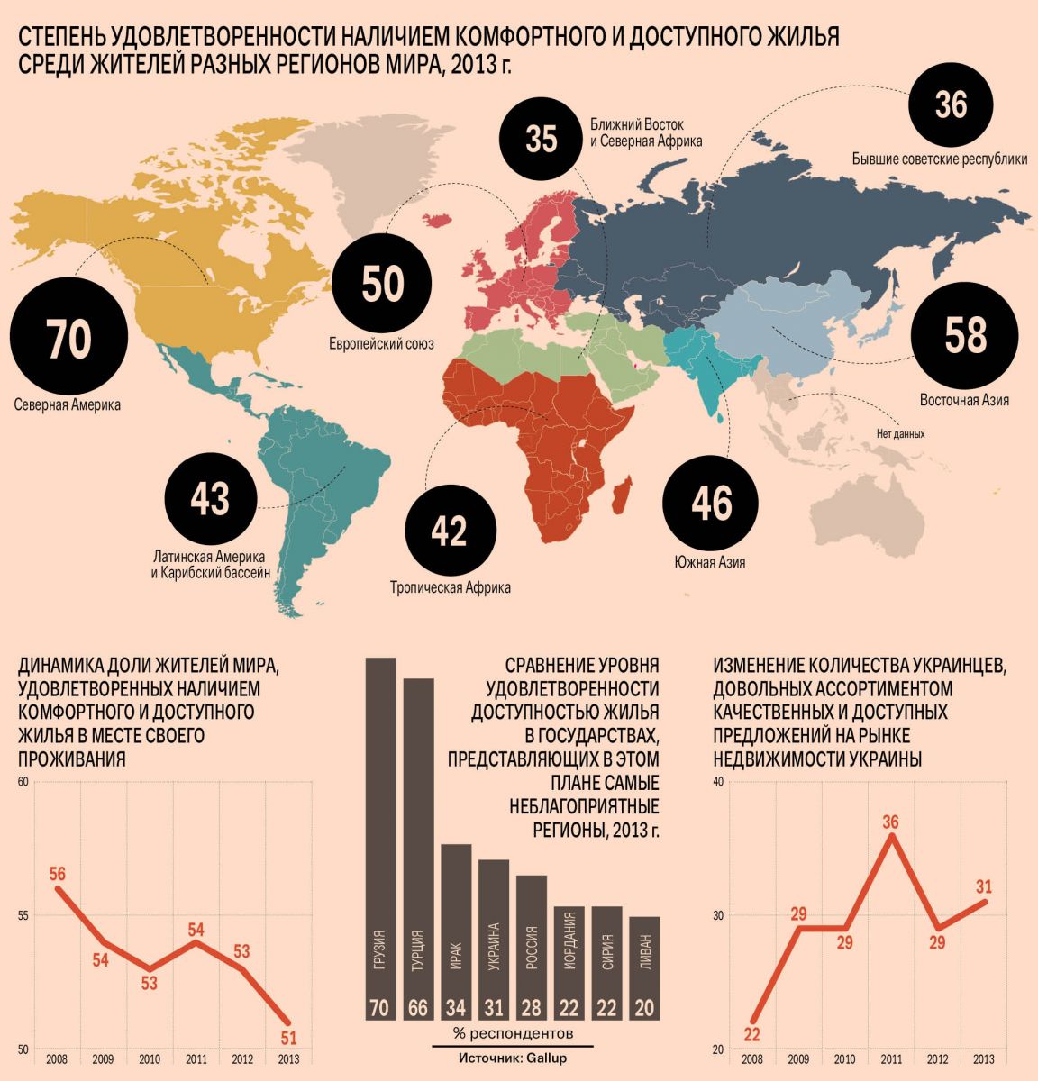 При сравнении итогов опроса Gallup в самых неблагоприятных регионах мира о наличии недорогой недвижимости выяснилось, что степень удовлетворенности украинских жителей ассортиментом недорогого, но комфортного жилья превышает показатель соседней России (28 % респондентов) и ряда ближневосточных государств, продолжающих страдать от постоянных терактов и политической нестабильности. С другой стороны, показатель нашей страны более чем вдвое ниже грузинского (70 %), а также уступает степени удовлетворенности жителей Ирака (34 %).