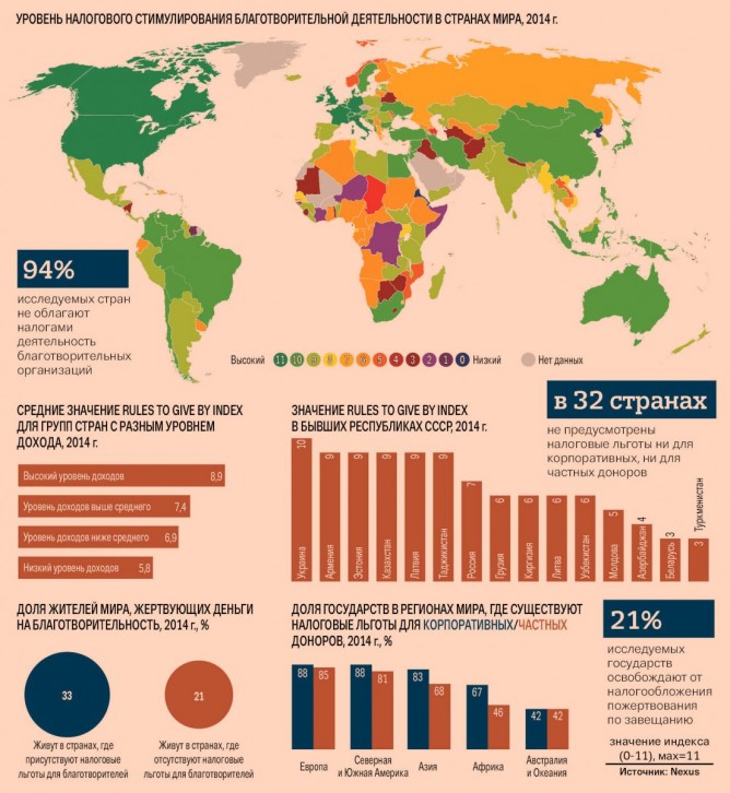 На сегодняшний день наша страна входит в число 43 государств мира, чьи национальные системы налогообложения больше других способствуют развитию благотворительности. Таковы результаты исследования «Rules to Give By: A Global Philanthropy Legal Environment Index», проведенного международной общественной организацией Nexus совместно с юридической компанией McDermott Will & Emery и благотворительной организацией Charities Aid Foundation.