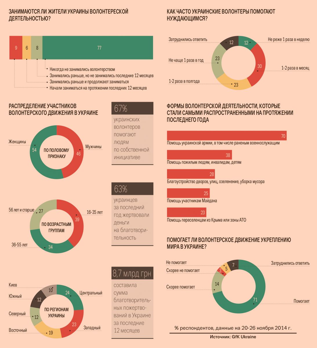 Наиболее распространенной формой волонтерской деятельности в Украине за последние 12 месяцев стала поддержка украинской армии, в том числе помощь раненым военнослужащим, которую оказывали семь из десяти участников волонтерского движения. Четверть волонтеров нашей страны помогали активистам Майдана, а 23 % — переселенцам из оккупированного Крыма и зоны боевых действий.